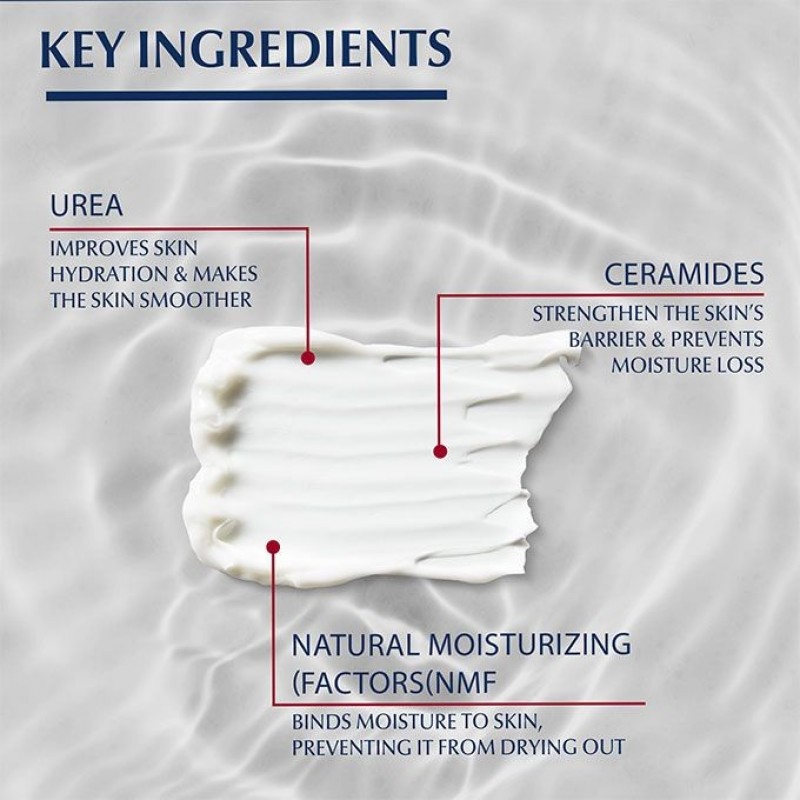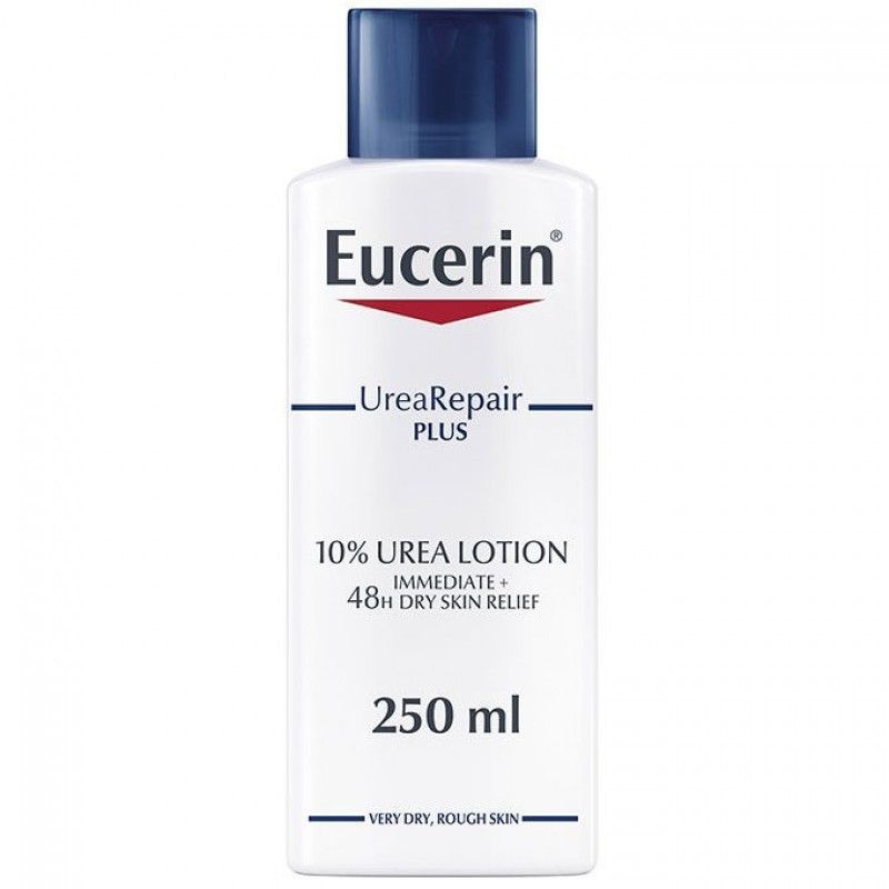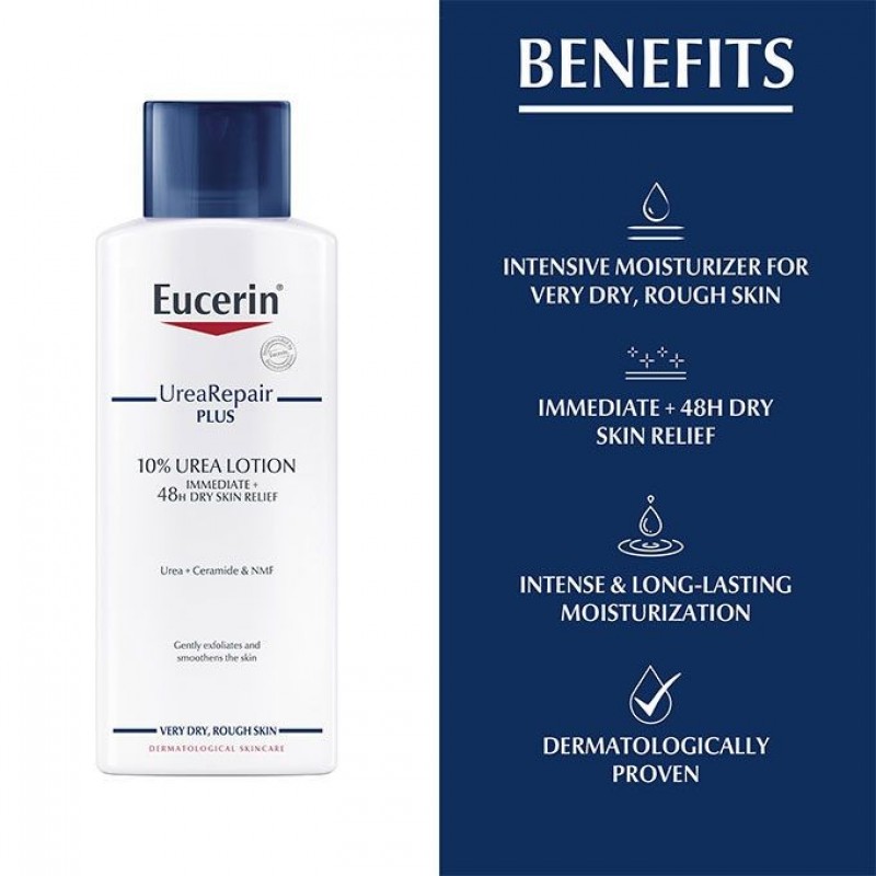 Eucerin UreaRepair PLUS 10% Urea Lotion gives very dry, rough body skin the daily care it needs. It contains a unique combination of ingredients – Urea, Ceramide and other Natural Moisturizing Factors (NMFs) – which bind moisture in and repair skin's natural protective barrier to prevent further moisture loss. The formula has been clinically and dermatologically proven to deliver immediate relief and intense, long-lasting moisturization, delaying dryness and roughness for up to 48 hours. Skin is intensely moisturized and looks and feels smooth and supple again.
