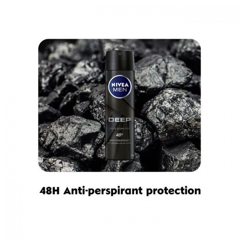 NIVEA MEN DEEP Anti-Perspirant Deodorant Spray with a Black Charcoal formula acts powerfully against bacteria and sweat while eliminating body odour with a modern and masculine Dark Wood Fragrance. The effective formula leaves you feeling as if you have just stepped out of the shower and gives you long-lasting dryness all day.